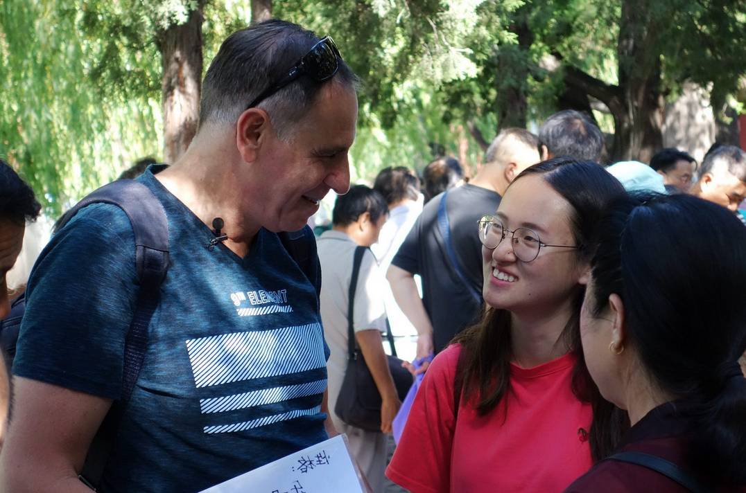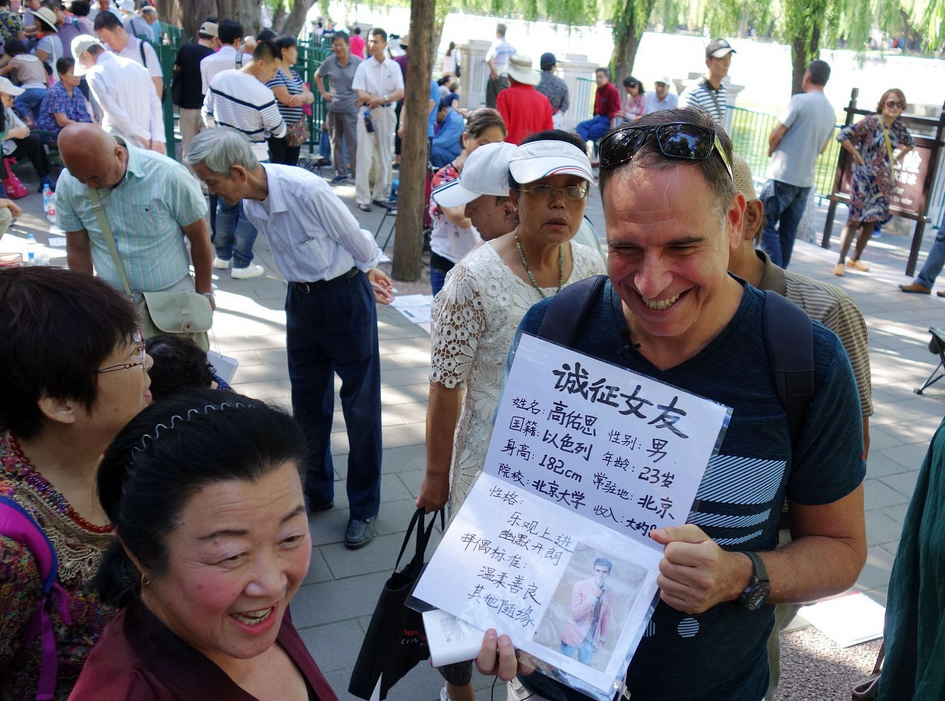 这位外国老爹名叫阿米尔,以色列人,现在一家投资公司工作。他热爱中国、喜欢北京,希望同样在京工作的儿子能找个中国女朋友结婚。9月17日,他来到中山公园相亲角,举牌为23岁儿子高佑思征婚。择偶标准:温柔善良,其他随缘。