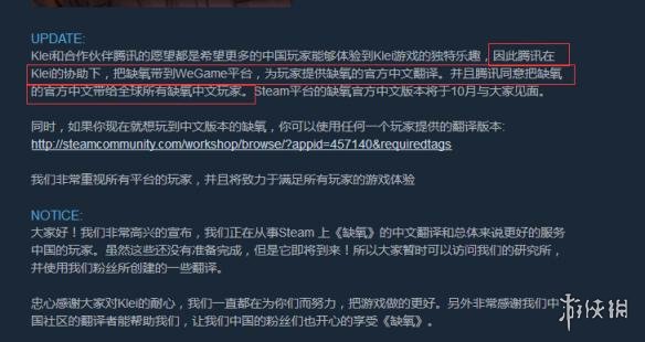 此前《缺氧》没有官中,想要玩到中文版的需要到创意工坊上自己下载,随着玩家们刷差评后不久官方宣布推出Steam版《缺氧》官方中文,玩家们当然是奔走相告,这让玩家们觉得刷差评求中文是有用的。然后有趣的事情来了,Steam版《缺氧》官方21号又发布了一个公告,厂商说steam上的官方中文也是腾讯做的......