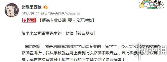 9月22日晚间有大学生在微博发布声明称,小米在郑大招聘宣讲会上涉嫌专业歧视,要求公开道歉。