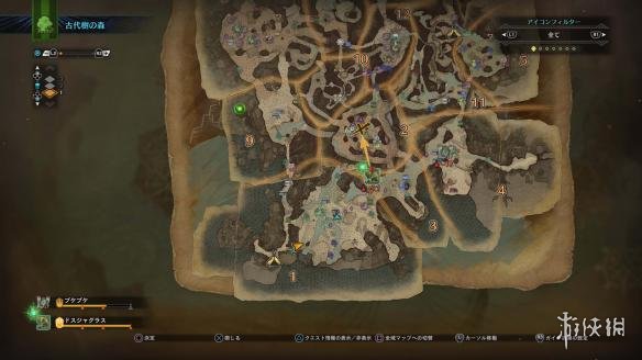 在各个狩猎场上,都有很多能够在狩猎中派上用场的物件。只要使用「生态地图」,就可以一眼看出在哪边有些什么东西。也可以透过图示过滤器,依照目的切换显示情况。