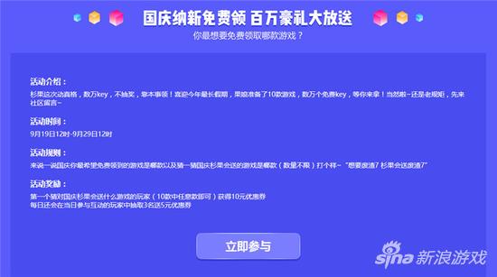 根据杉果提供的确切消息,活动期间将发放总计10万个免费游戏,而每天限量发放10000个且每名玩家仅限领取一款,以杜绝瞬间被秒的尴尬局面。另外,免费游戏的发放针对新老用户分批开放,且有着大致相当的单独配额,这意味着即便领取的时间不同,领到游戏的机会也不会产生过大悬殊。