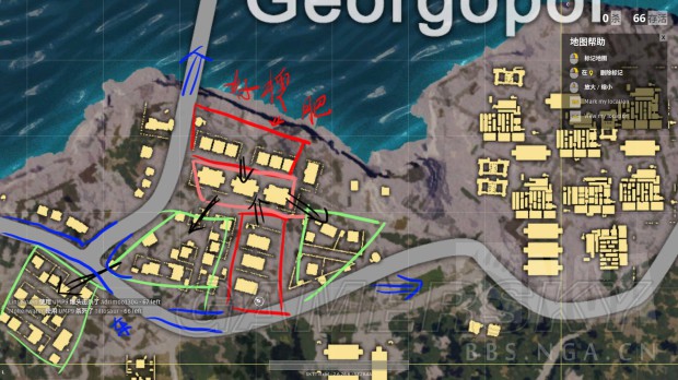 红色标记的圈是人多的主要搜点,黑色标记的圈是打野的主要搜点。