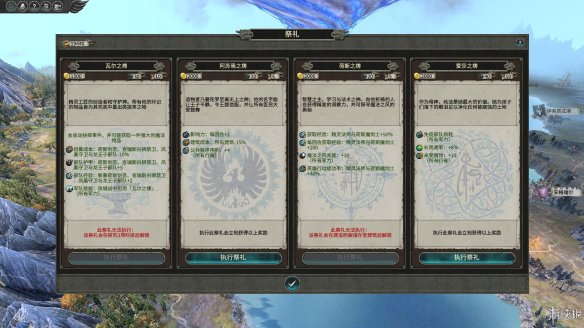 四个新的种族带来了新的派系特色。如同一代时矮人派系的大仇恨之书,在本作之中,玩家同样可以消耗特殊资源来为派系领地争取额外优势,如高等精灵可以消耗引路石碎片来举行“祭礼”,换取如招募成本减免、领土未受腐蚀值增加、补员速率增加、建筑成本降低等优势。当然,诸如“引路石碎片”这类特殊资源,获取效率较低,并且也是胜利条件之一,使用时需要仔细考量。
