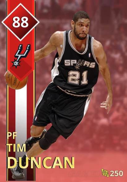继续说红卡邓肯,这张卡价格很高,但个人认为很不划算,内线进攻和防守都很优秀、速度够用,但除此之外,投篮能力差,中投只给了65 三分没有,也没有持球能力,用下来不如威利斯,性价比不高,没有情怀不建议集。