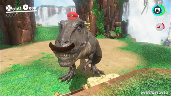视频展示了马里奥在“瀑布王国(Cascade Kingdom)”的冒险,主要内容有收集月亮,在商店买东西可以改变马里奥的形象。马里奥还能够用帽子来操控恐龙,有趣的是,被操控的恐龙不仅戴着马里奥的帽子,还出现了马里奥标志性的胡子,显得有些滑稽。