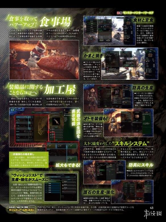 在加工屋里可以进行各种装备生产和强化,强化和生产武器装备时可以看到派生图,非常的便利,技能也不再是以前的点数制度了。顺带一提本作中护石可以和防具一样进行制作,而且技能不是随机的是固定好的。