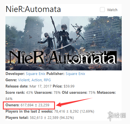 这是一个以统计Steam上游戏销量为主的第三方网站。在这家网站上我们可以看到一款游戏销量的详细统计数据,不仅有游戏的总体销量还有其在各个分区的销量(分区销量需要登陆才能看到)。以下面的最近总体销量刚刚超过的《尼尔:机械纪元》为例:
