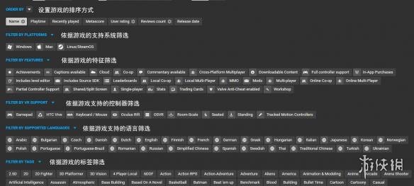 也可以根据游戏类型(有无成就系统、是否支持云存档、是够支持本地合作、单人游戏还是多人游戏等等)、游戏支持的语言以及大量非常具体的游戏标签(FPS、RPG、JRPG、PVE以及PVP等等标签)对你的游戏库进行筛选。
