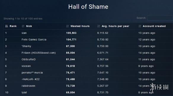 其实这个网站的功能和上面的SteamDB略有重复,但是这个网站有意思的是,它不仅统计出了你Steam游戏的全部耗时,还列出了一个Steam游戏耗时的“耻辱榜(Hall of Shame)”(注:名人堂为Hall of Fame)。