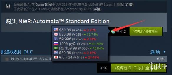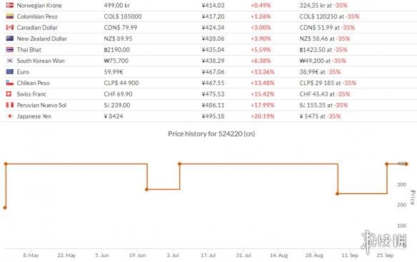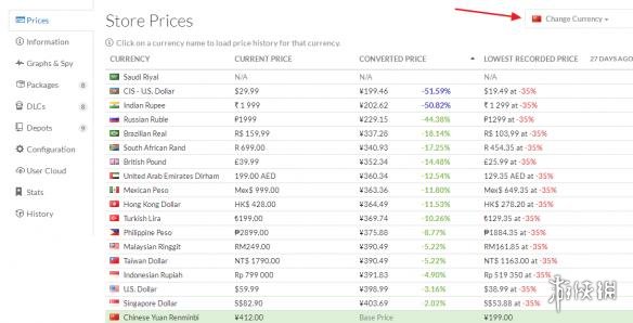 价格方面的最低价格(多数为国外第三方网站)以及游戏在主要的几个Steam分区的售价情况: