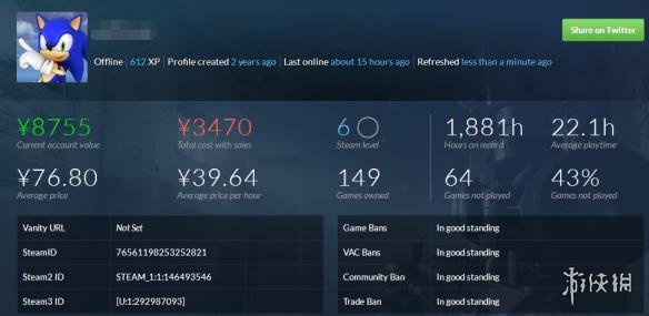 在这个页面,大家输入自己的ID之后(还是建议使用你的Steam个人资料网址中的那个数字ID)。就可以看到以下关于你的Steam账号非常有趣的信息(以游侠编辑部某位小编的查询结果为例):