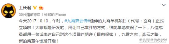 工长君在微博上宣布,《九霄奔云传》的单机延伸项目立项,游戏代号“玄霄”,新篇章自此正式开启。