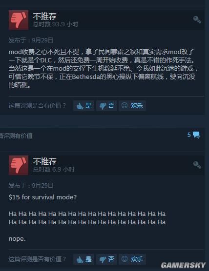 国内外玩家都对这个模式表达了批评,指出这付费的模式还不如免费的MOD做得更有诚意。也有玩家直接指出《上古卷轴5:天际特别版》的这个生存模式就是把民间的寒霜之秋和真实需求MOD改了一下。外媒《PC Gamer》的编辑也表示,在体验了几个小时之后感觉这个模式还不如免费的MOD有深度。