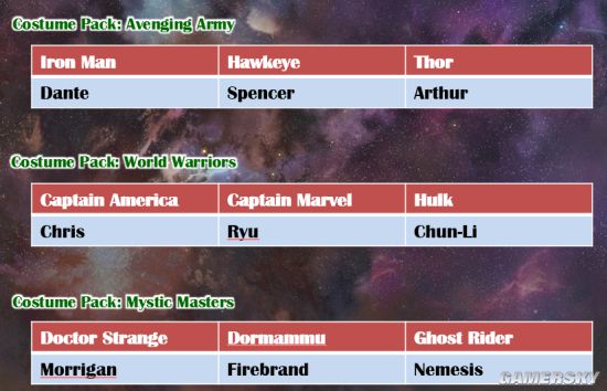 Capcom角色:Dante、Spencer、Arthur、Chris、Ryu、Chun-Li、Morrigan、Firebrand、Nemesis。