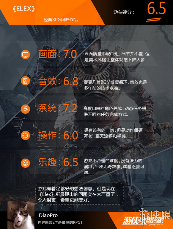 本作如果放在五年前推出,笔者肯定会大加赞赏强力推荐,但是在今天看来《ELEX》真的对不起我们的期待,让很多新玩家无法在头几个小时体会到任何乐趣,游戏的画面差,剧情演出生硬,动作僵硬毫无打击感。对于老玩家,游戏退步的角色AI,吃老本的游戏框架,过于平淡剧情,实在也让人难以满意。在这个大量量产模块化开放世界的时代,《ELEX》本可以做得更好,顺便说一下,这次背包无限大,垃圾捡到爽。