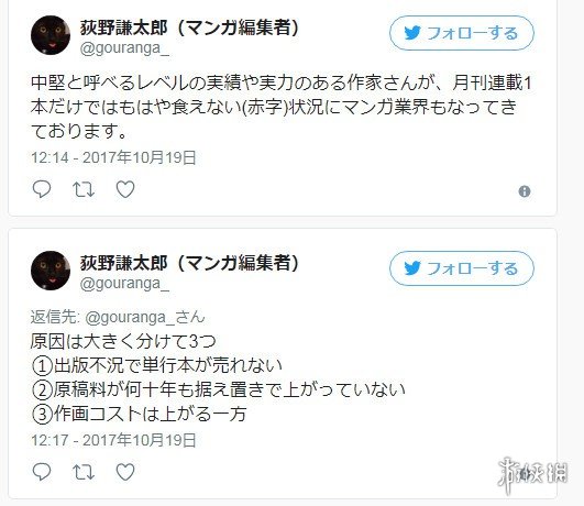 这名叫做荻野的漫画编辑表示:“现在有一些从成绩跟实力方面能够称得上是‘中坚力量’的作家,光靠每个月在月刊上连载一部作品已经活不下去了(赤字)。”而在谈到原因的时候,他列举了三点个原因:因为纸质书的出版不给力,所以单行本卖不掉;原稿的报酬已经很多年没有增长了;作画的成本不断提升。现在很多漫画家不但被要求提升自己的作画能力,而且还得自己在社交平台对作品进行宣传才行。他认为除了一部分人气作品之外,现在的商业出版已经没有过去那样强大的力量了,漫画杂志连年下降,中规中矩的漫画作品的单行本销量真的很惨。