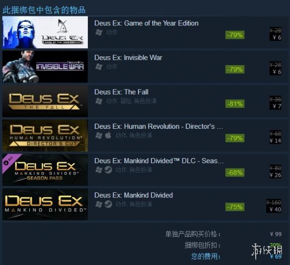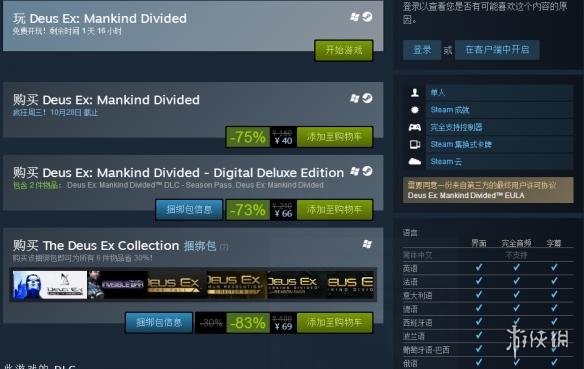 该系列的最新作《杀出重围:人类分裂(Deus Ex: Mankind Divided)》本体优惠75%,现价40元;季票优惠68%,现价26元。此外这部备受媒体好评(Meta:83,IGN:9.2)的新作目前也开启了免费试玩活动,截至发稿,还有一天多的时间可以免费体验。但目前这部新作还不支持中文,优化方面也存在一些问题。