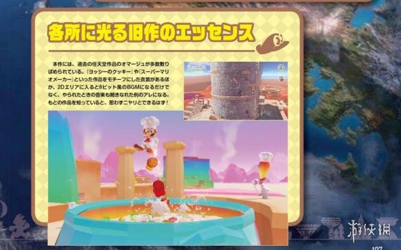 在本作中有很多向以往《马里奥》作品致敬的地方。除了以“耀西的饼干”、“超级马里奥mega”等作品为主题的衣装以外,各种2D地区的8位机风格和被干掉后的BGM都让人无比怀念。