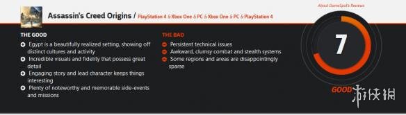 在具体的评测中,GS表示游戏呈现了非常美丽的古埃及这个遥远的文明,游戏在画面表现、场景细节以及故事剧情等方面做得很到位。但游戏还是存在很多技术性BUG,游戏的战斗和潜行则有些呆板,一些区域的设置则有些多余。