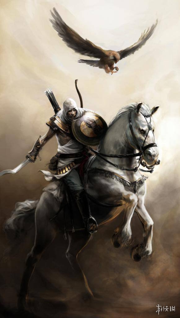 下面这张是育碧首次公布的,《刺客信条:起源》开发工作室育碧蒙特利尔的艺术家Vincent Gaigneux所创作的,游戏主角巴耶克横刀跃马的概念原画: