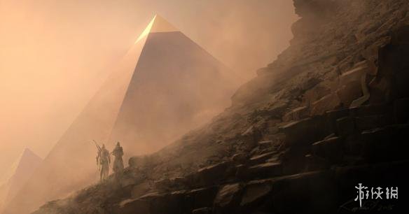 下面这张则是游戏艺术总监Raphael Lacoste分享的,早在2014年就完成的一张游戏概念原画,展示了风沙中壮丽的埃及金字塔: