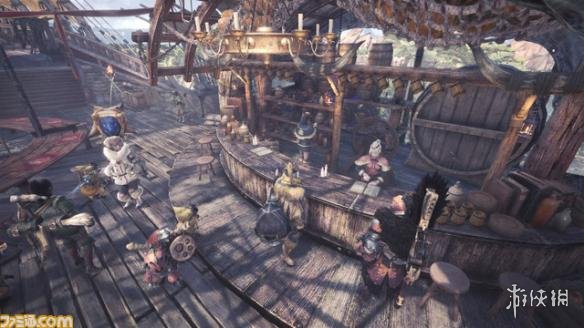 在船的甲板处的酒场“星之船”是本作的线上集会场地,一个集会场地最多支持16人进行线上联机互动。值得一提的是经典猎人小游戏扳手腕比赛在本作中复活。(小编当初玩MHF的时候可是每天必玩扳手腕的)排除某些设施,玩家在离线模式下也可以使用集会广场。