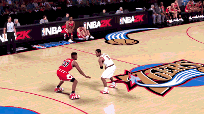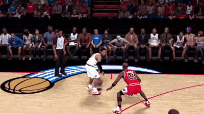 照例先来了解下艾弗森的节奏运球。原地运球状态下右摇杆向前轻推一下,即可触发该动作。每名球员的节奏运球,动作、节奏、幅度略有不同。