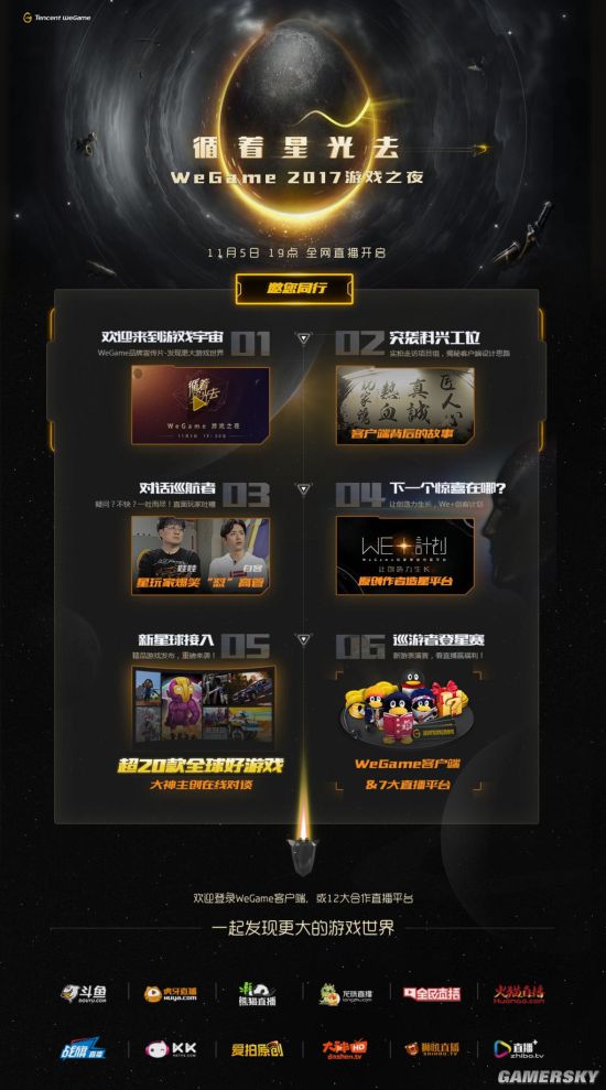“循着星光去”倒计时预热已经进行了几天了,伴随着许多业界名人和游戏知名玩家的寄语和祝福,11月5日19时,WeGame游戏之夜活动即将全网直播开启!
