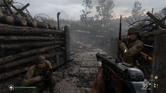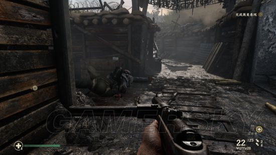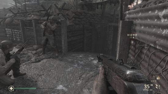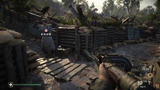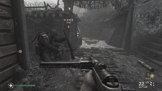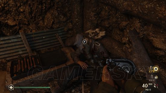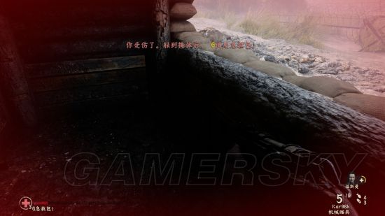 在前往要清扫碉堡的时候,会在战壕中遇到这个需要帮助的队友。