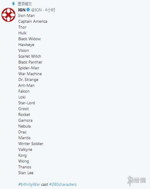 今日,推特正式解禁了280字符,不少推友都发推测试了这项新的改动,IGN也参与到了280字符活动(#280characters)中来,不过IGN列出的不只是字符,而是真正的角色——《复仇者联盟3:无限战争》的角色表……玩还是IGN会玩……