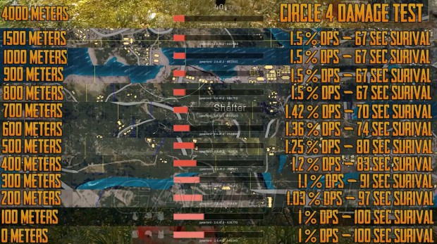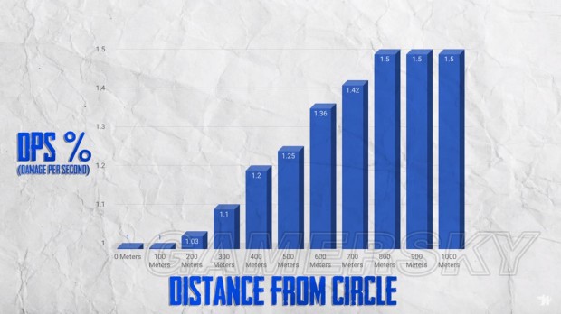 2.从第2圈开始,距离蓝圈边界200-800m,伤害会随距离变大,但增加幅度仍不明显,最高伤害每秒0.68(距离200m以内的基伤是0.6)。