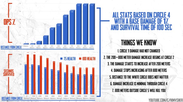 这次的更新没有改变蓝圈基本伤害,也就是如果你刚好在安全区外(距离~0),每秒伤害是跟以前一样。