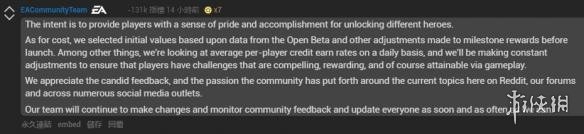 在早前玩家发现游戏中太过于强调氪金元素的时候就在REDDIT发帖,而EA官方账号EACommunityTeam则回复到之所以设计成要花那么多时间解锁英雄角色,其目的是为了让玩家在解锁不同英雄后获得自豪感和成就感。制作组通过Beta测试的数据来设定各类解锁和挑战,然后根据玩家们的具体情况不断调整,以确保游戏带给玩家有吸引力的挑战。
