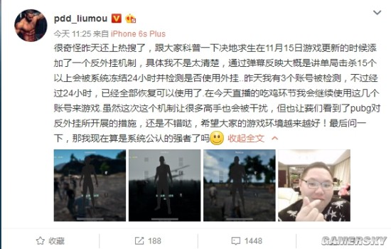 PDD表示“昨天有三个账号被检测,不过经过24小时,已经全部恢复可以使用了。虽然这次这个机制让很多高手也会被干扰,但也看到了PUBG对反外挂所开展的措施”。