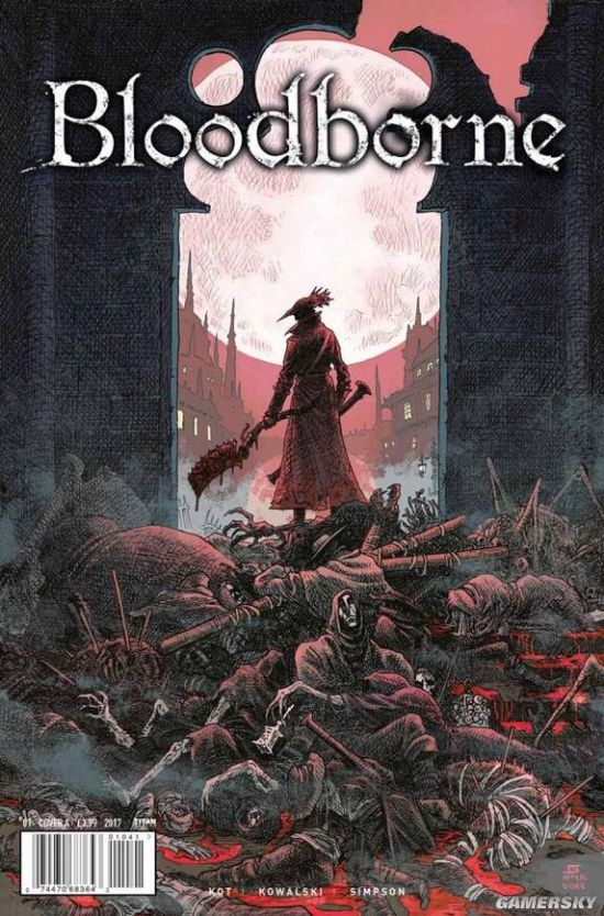 由Titan Comics制作预计在2018年2月份推出的《血源》衍生漫画在今天公开了第一期的封面。封面上猎人身着经典服饰,以红月为背景,手持锯肉刀站在尸骸之上露出一个背影,十分阴森瘆人。
