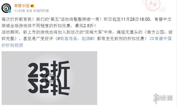 即日起至11月28日18:00,育碧中文商城全场游戏将有不同程度的折扣优惠,最低2.5折!而真正的“黑色星期五”,没点大动作怎么行?活动期间,热销的《看门狗2》价格竟然从原价248元打折至84.3元,新晋上市的游戏也将首度加入到这次的“促销大军”中来,搞怪无厘头的《南方公园:破碎完整》,甚至是广受好评《刺客信条:起源》都将有史无前例的折扣优惠!
