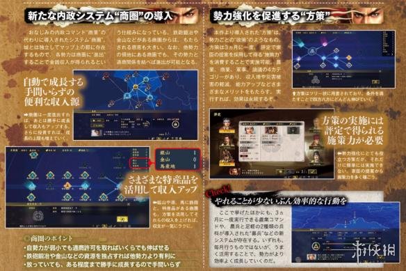 从本作开始导入的“方策”是一种类似每个势力拥有的“政策”一样的系统,使用采用家臣提案获得的“施策力”可以进行实施。种类分为农业、商业、军事、议论4种,拥有可以增加收入、减轻灾害、能力上升等好处。一旦实施,效果会永久持续。