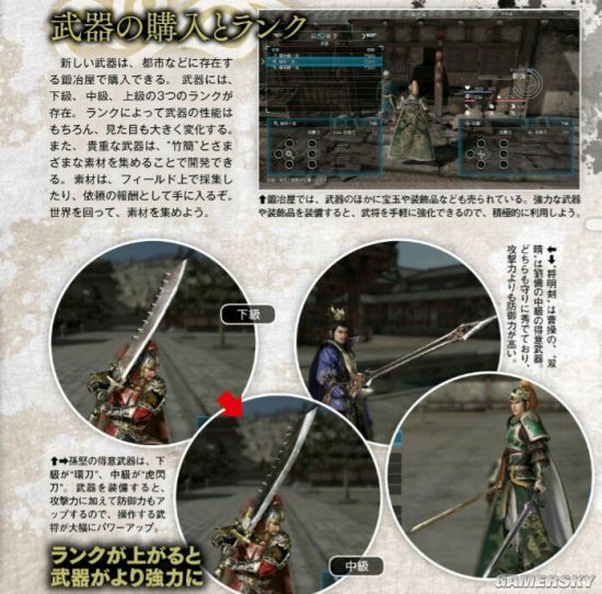 玩家能够在锻冶屋购买新的武器,武器分为上中下三级,外观性能都大不同,贵重武器的话还需要收集“竹简”等材料制作,可以在野外采集,也可以通过奖励获得。
