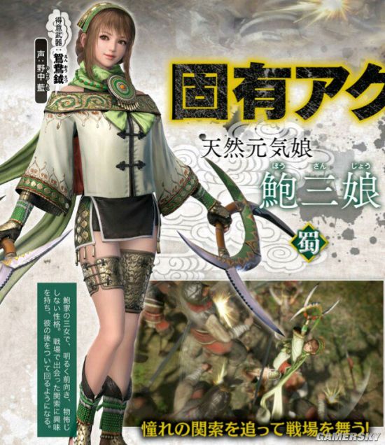 几名武将在造型上和前作又有了不少的变化,鲍三娘的服装大变样,从V领紧身上衣+蕾丝小短裤变成了露肩大衣?衣服上增加了更多少数民族特色;而司马懿之妻张春华也从妖艳的人妻变得更加保守,中间开叉的裙子改成了侧开的长裙,裤袜也从镂空换成了绑带,越穿越厚,但是胸前依旧是分量十足。