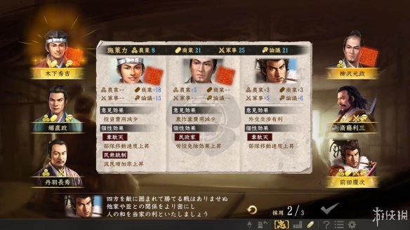 「评定」的流程初见时非常简单,在过程之中,家臣们会轮番对大名提出各类提案。而每一次评定之中,身为玩家的你都可以选择三项提案来进行实施。通过采用提案,你不仅能够获得可以立刻发挥效果的「追加效果」,与此同时你的势力还能够获得「施策力」。消耗施策力,就能够实行强化势力的「方策」。
