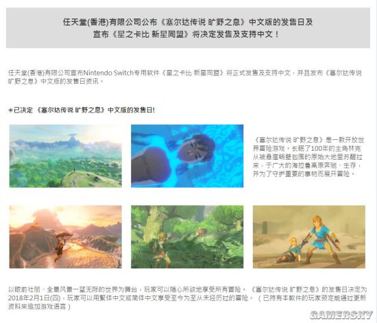 任天堂(香港)有限公司公布《塞尔达传说:旷野之息》中文版将于明年2月1日发售。玩家可以用繁体中文或简体中文享受至今为至从未经历过的冒险,已持有本软件的玩家预定能通过更新资料来追加游戏语言。
