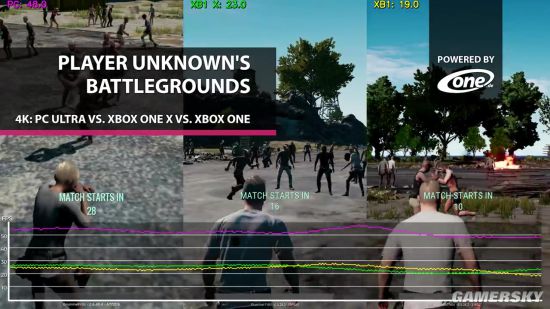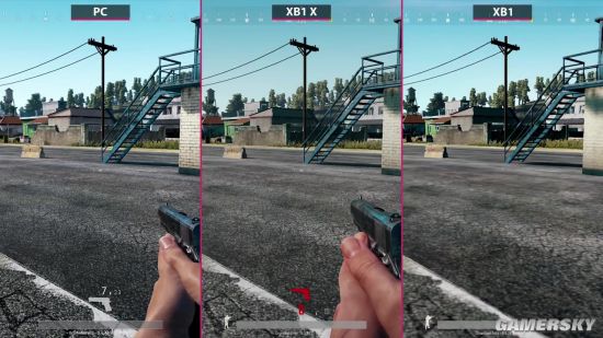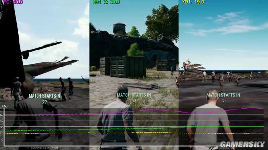 从这段视频中,我们可以清楚地看到,PC版《绝地求生》的4K画面明显优于Xbox One X和Xbox One版本的游戏画面,帧数方面,PC版的画面一度达到了60帧,Xbox One X的画面则稳定在30帧,而Xbox One的画面帧数则在30以下浮动。