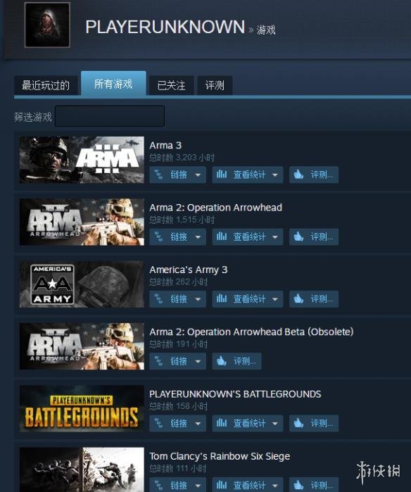 Steam上可以查到布兰登·格林游戏时长最长的几款游戏