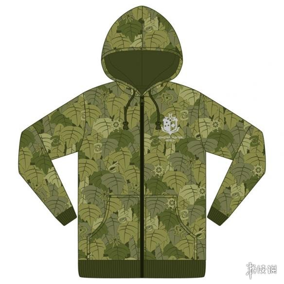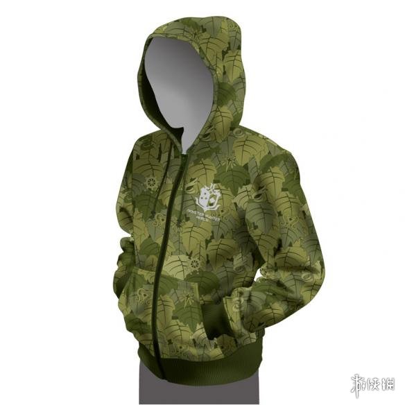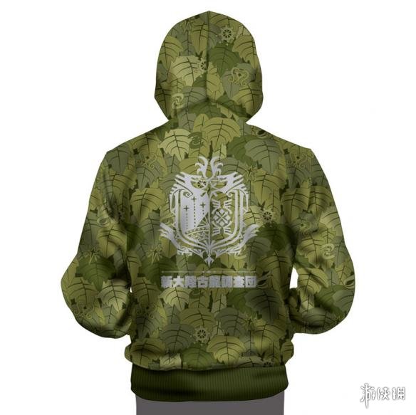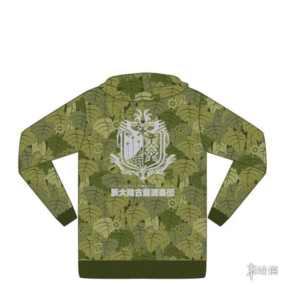 从公布的图片中,我们可以看出这是一款拥有绿色树叶印花的“狩猎吉利服”,在衣服的正面和背面都印有游戏中“新大陆古龙调查团”的徽章: