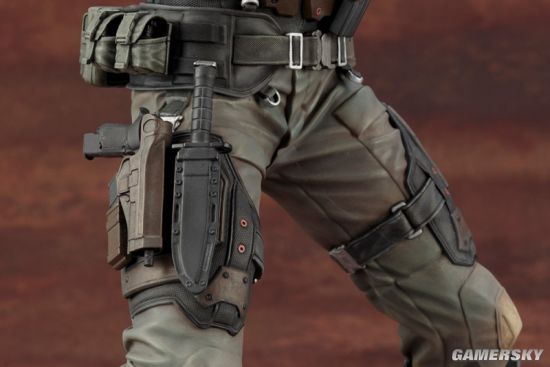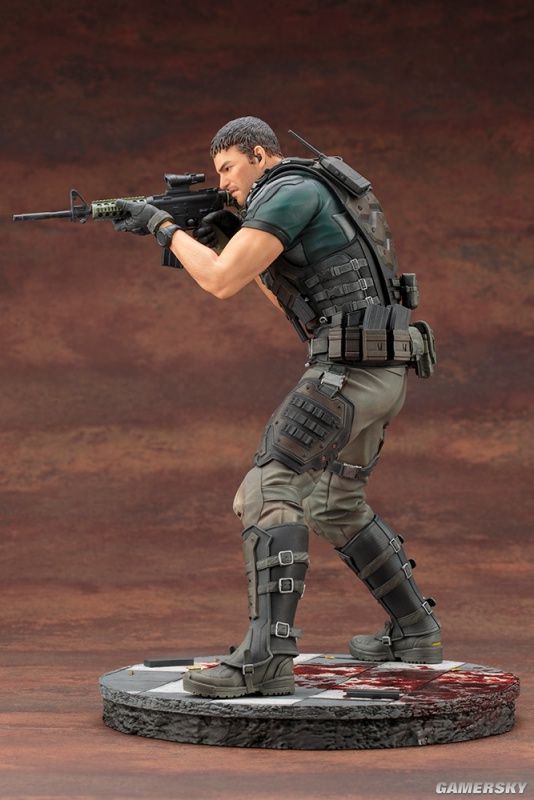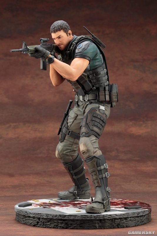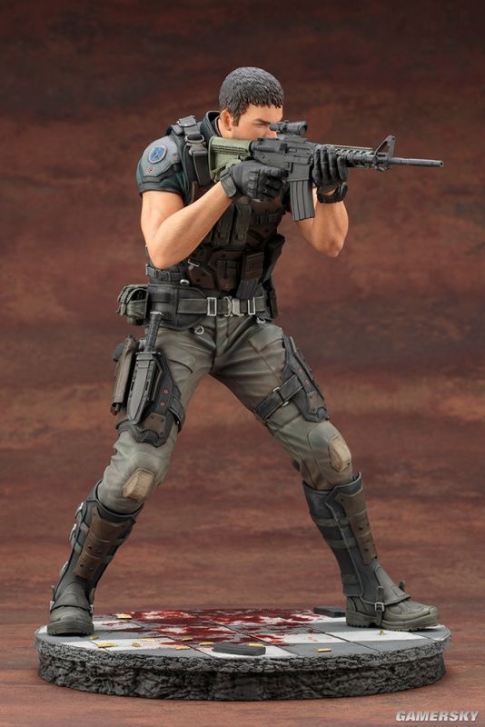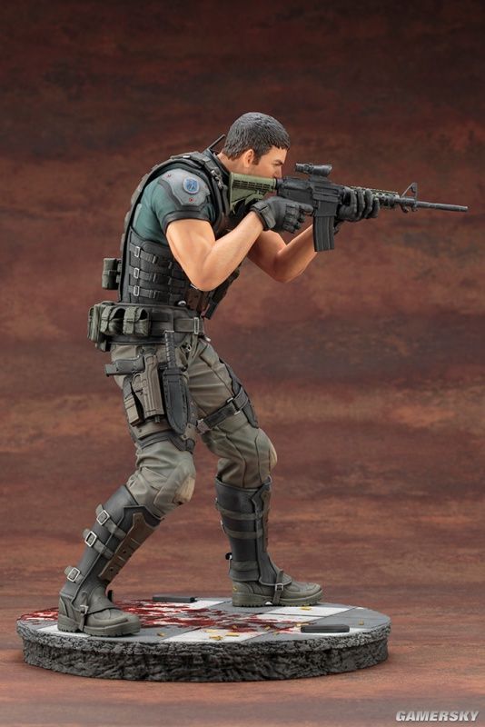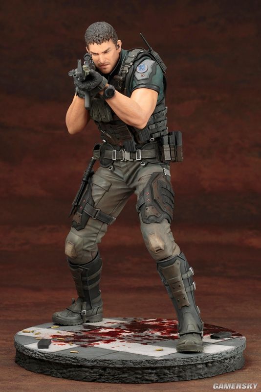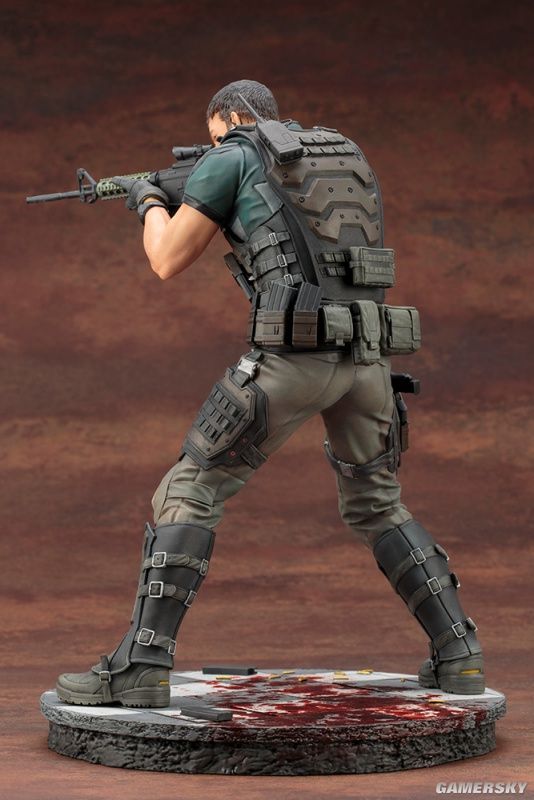 我们可以看到,这两款手办的整体造型均为双手持枪作瞄准射击状态,两人脚下都有一滩血迹。仔细观察手办的细节,我们会发现,除了衣着特点还原到位之外,我们甚至能看清克里斯手臂上的汗毛,可以说是十分考究细节了。