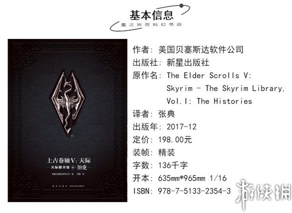据@星之所在科幻书店介绍,这本官方设定集拥有精美装帧,完美还原游戏本体世界,正版授权,是官方指定的《上古卷轴5:天际》的中文版资料设定集。设定集将以官方权威的视角,公布珍贵的史料,可令玩家大开眼界。