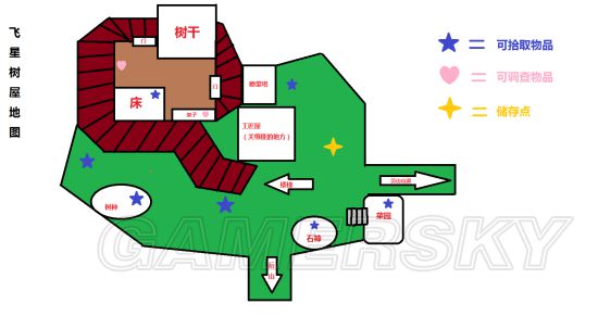 出来先上楼,进屋子,床上有补好的裤子拿走。弓和木雕娃娃可以调查。下楼,正对着的石头上有蘑菇可以采,蘑菇后面的台阶上,草丛里有神秘物品杂玉。后面有个宝箱给平疮散,旁边有颗发紫光的树靠近会掉落香甜树果。顺着小道深入,可以捡到神秘物品烟玉。绕过房子另一侧,最里面有神秘物品杂玉x3,然后摸壶存档。