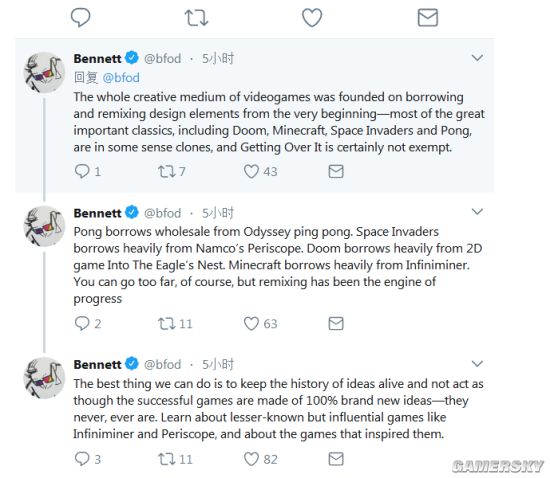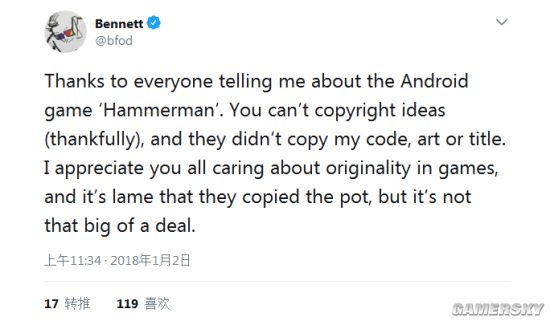 对此,《和班尼特福迪一起攻克难关》的制作者班尼特倒是显得十分冷静,他今日在Twitter上发表声明,感谢大家告知他有关“掘地求升”山寨手游出现的事情,他非常感谢大家对游戏版权的支持。其次,他还对这种山寨他游戏的行为表示了斥责,认为他们很扯很蹩脚。但是在他看来,这并不是什么大不了的事情。