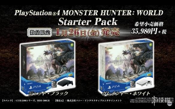 《怪物猎人世界》限量同捆PS4主机将同游戏一起于1月26日发售,售价35980日元+税,主机有黑白两款,其中附赠一个月PS+会员。