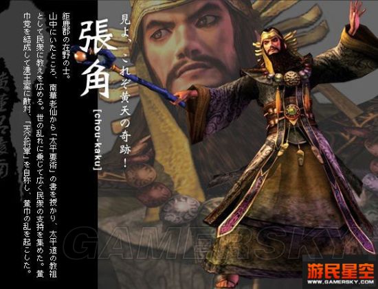 有是一位出《真三国无双》初代就登场的角色。张角一直保持着黄巾教主的形象。无论形式在变,造型当中长袍法杖都不可缺,果然是一个神叨叨的巫师角色。